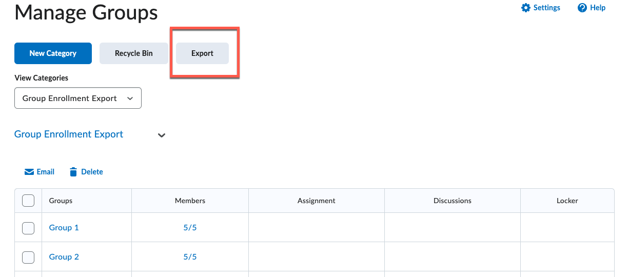The Export button, now available in the Groups tool, allows instructors to export group data to a CSV file that includes: