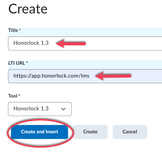 Under LTI URL, enter https://app.honorlock.com/lms and select Create and Insert.