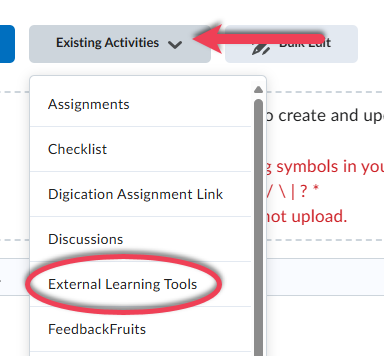 In content under the Honorlock module, select Existing Activities and then External Learning Tools.